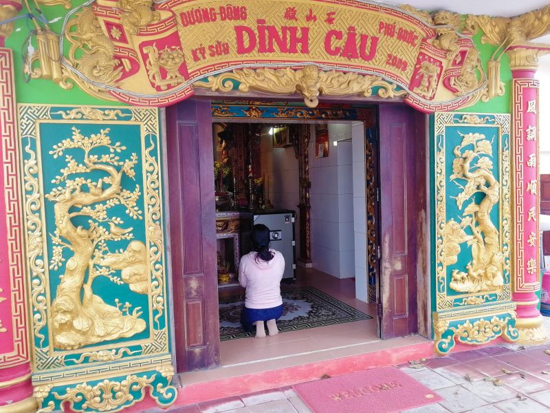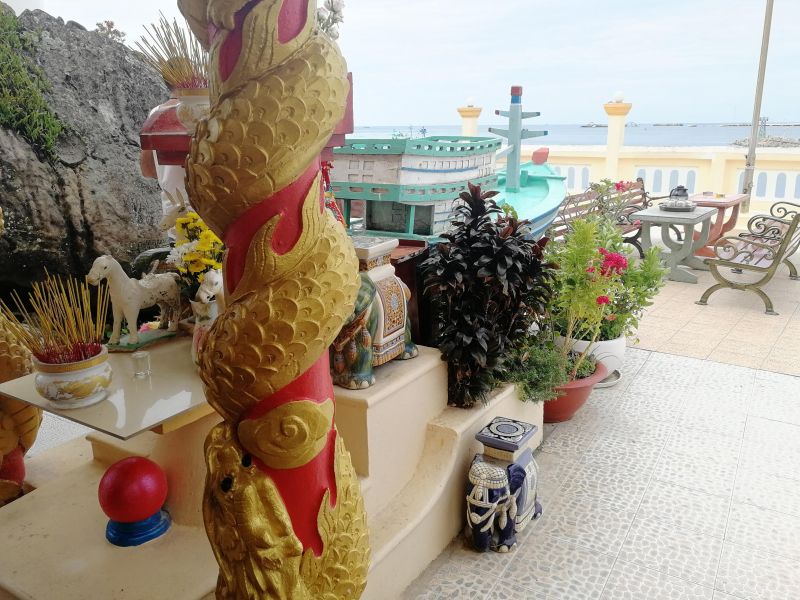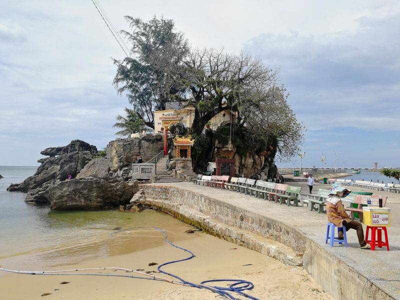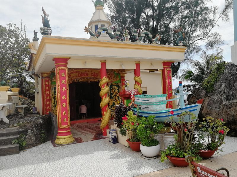 Тут же находится очень небольшой буддийский храм, его еще называют святилищем Динь Кау. Храм посвящен покровительнице рыбаков и моряков – богине Тхиен Хау. Перед выходом в море они приходят сюда, приносят дары и просят у богини хорошую погоду и большой улов. Или за них это делают их близкие женщины. Женщины также просят богиню защитить их мужчин от всяких напастей, с которыми те могут столкнуться в море.
