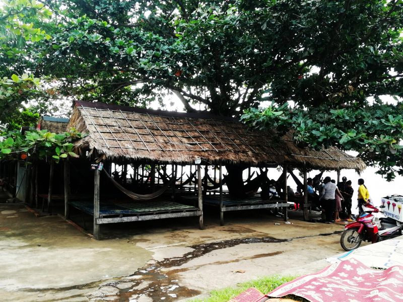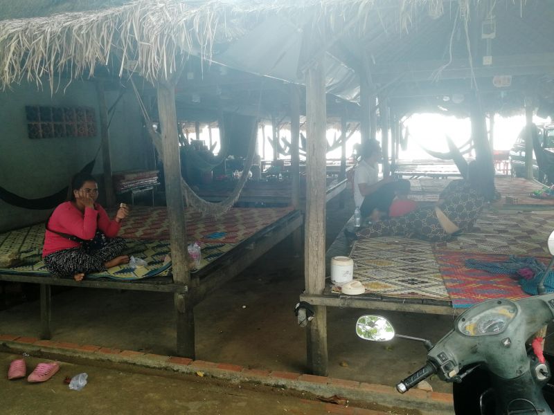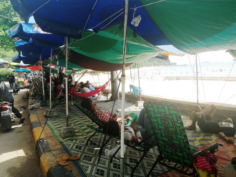 Камбоджийцы решили эту проблему просто – они устроили себе место отдыха прямо на прилегающей территории набережной. Разложили циновки, поставили зонтики, складные шезлонги. Кто отдыхает, а кто и торгует.