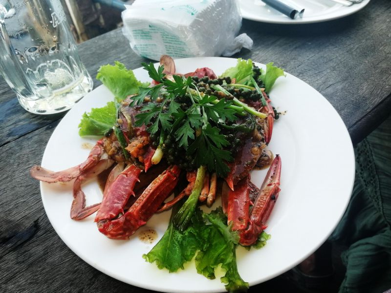 Следует сказать, что главная особенность голубых кепских крабов не только их голубые клешни. Главная особенность – это соус, который готовят только здесь по особому рецепту из зеленого кампотского перца. Помимо соуса блюдо обильно сервируют веточками приготовленного зеленого перца (на фото он под листьями петрушки). Интересный вкус. Совсем не острый. Но пикантный.