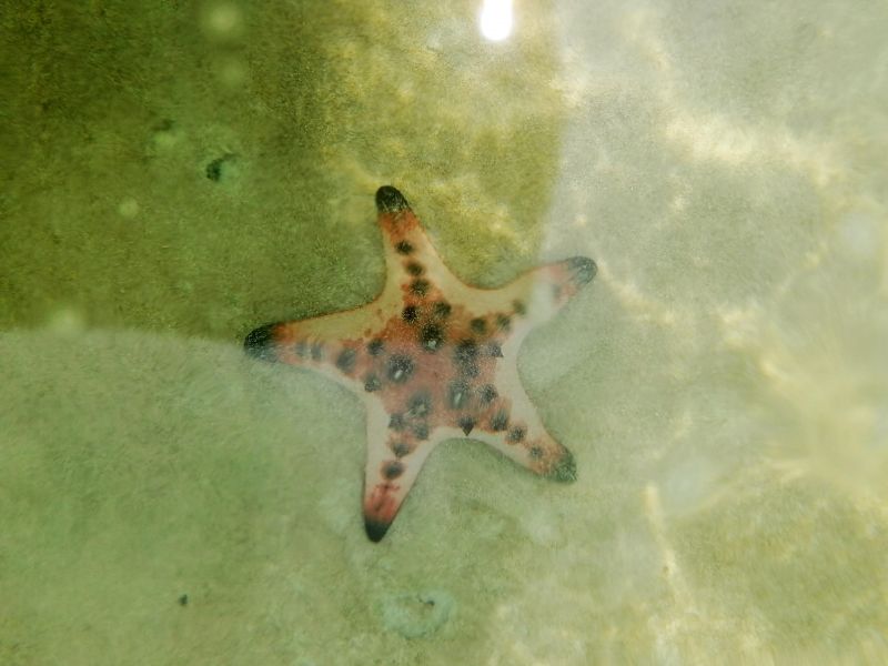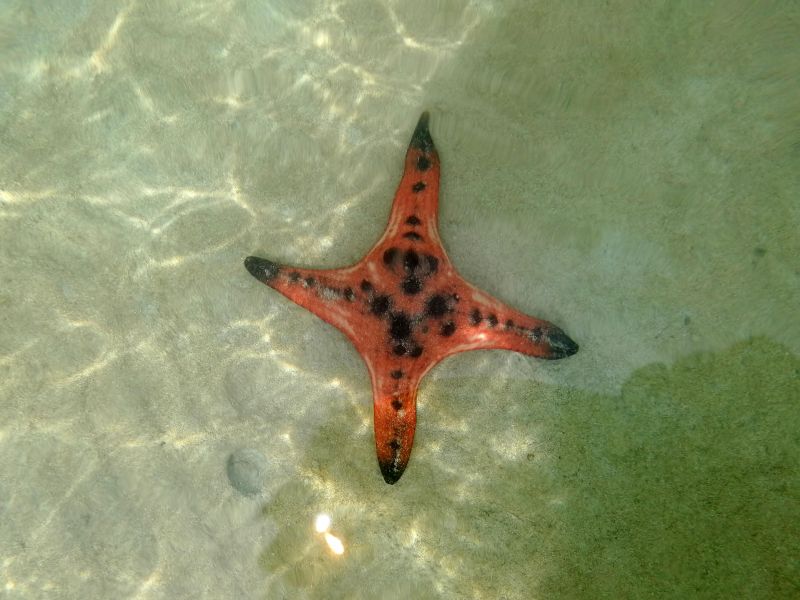 В одном месте увидели небольшой, чистый и безлюдный пляжик, решили искупаться. И здесь нас ждал сюрприз! Стоило только зайти в воду и на дне мы увидели множество морских звезд, очень крупных, разных оттенков оранжевого цвета.