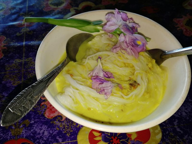 Здесь нас накормили очень вкусным супом, похоже, какая-то модификация амок-амока, с рисовой лапшой. На столе, как водится в азиатских кафе, стояли миски с разнообразной зеленью и тарелочки с красивыми голубыми цветочками. Мы решили, что они для украшения. А оказалось, цветочки надо есть, вместе с супом.