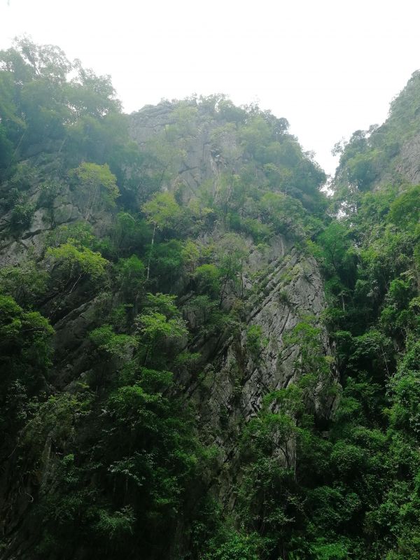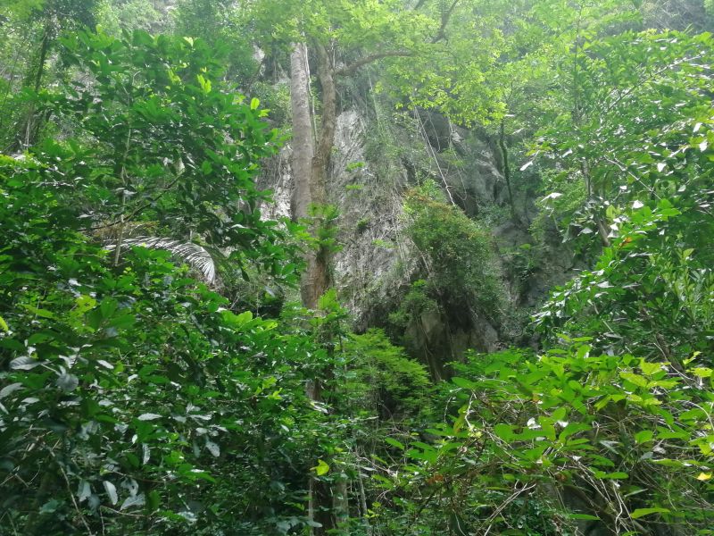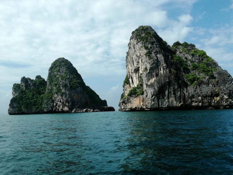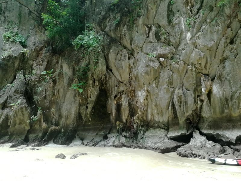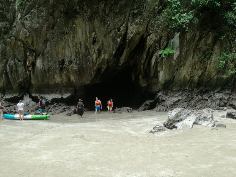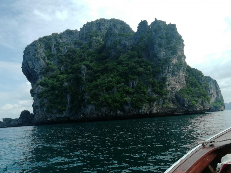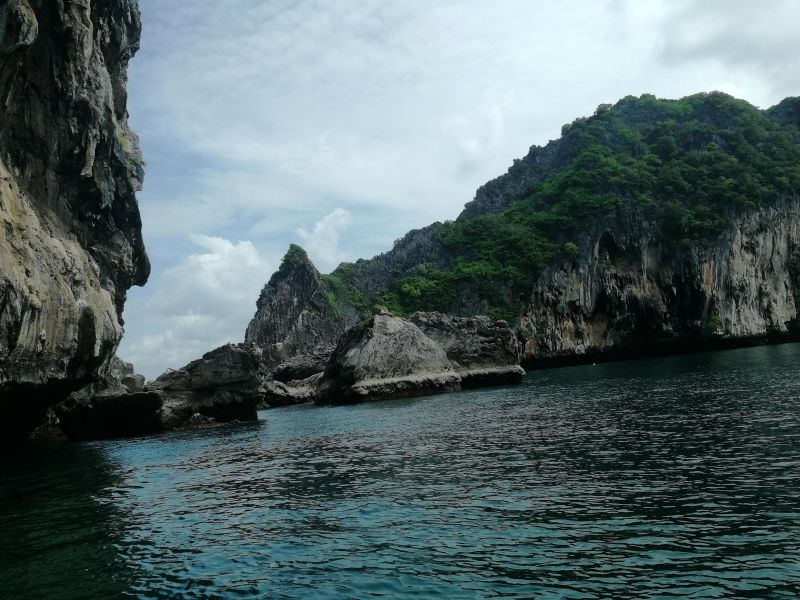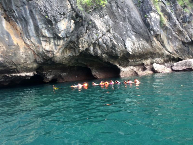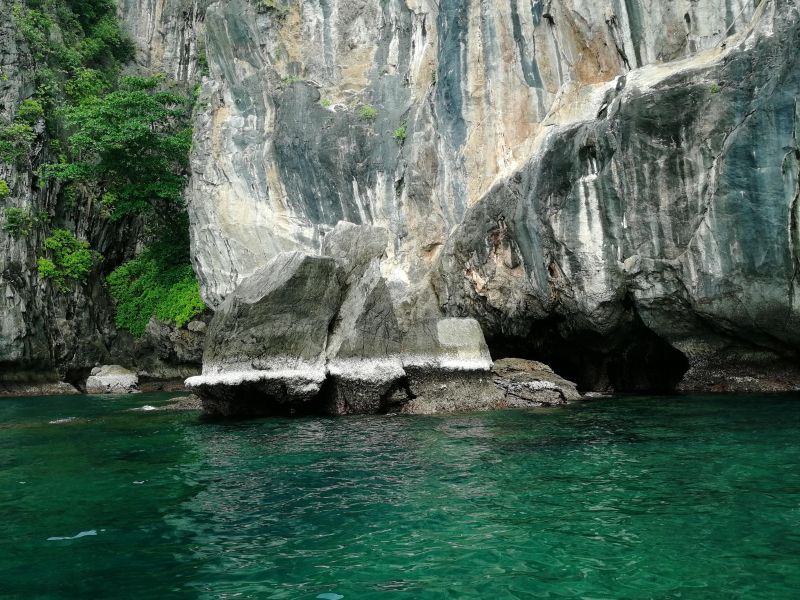 Изюминкой, или жемчуженкой тура, было посещение Изумрудной пещеры Тэм Моракот на острове Ко Мук. Мы подплыли к очередному острову. Там наш капитан с хитрым и таинственным лицом забрал у нас телефоны и велел всем надеть спасательные жилеты. Мы прыгнули в воду и поплыли за капитаном, как оказалось, к гроту.