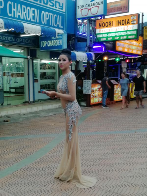 На противоположной от набережной стороне дороги расположено много кафе и ресторанов, из которых несется музыка, в том числе и живая. Трансы в шикарных нарядах зазывают посетителей.