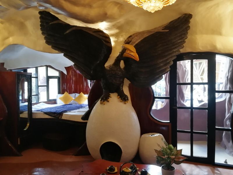 Это номер Орёл. Посреди гостиной находится стоит статуя орла с расправленными крыльями, восседающего на яйце. Внутри яйца камин – все камины в отеле действующие.