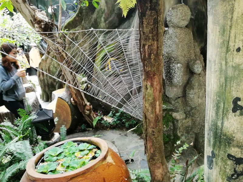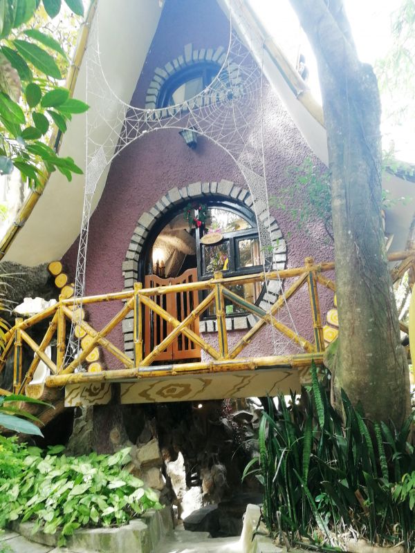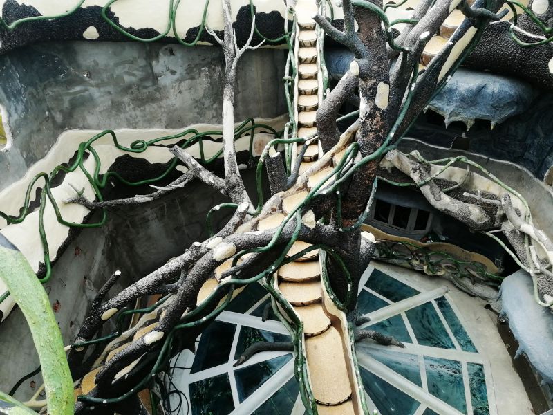 Дом как будто пришел из сказки и напоминает гигантское дерево, с переплетенными корнями и ветвями, поросшими мхом и опутанными паутиной. Между корней и ветвей расположены необычные дома, напоминающие жилища сказочных персонажей, в том числе, и из русских сказок, пещеры. А сплетенные корни и ветви образуют лабиринты из переплетенных лестниц, переходов, коридоров, в которых можно заблудиться.