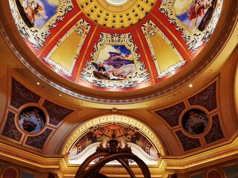 Внутреннее убранство сделано в стиле венецианских дворцов. И просто поражает роскошью и великолепием. Вот, например, подъездная зона казино – это еще даже не совсем внутри здания, а какая роспись на потолке!