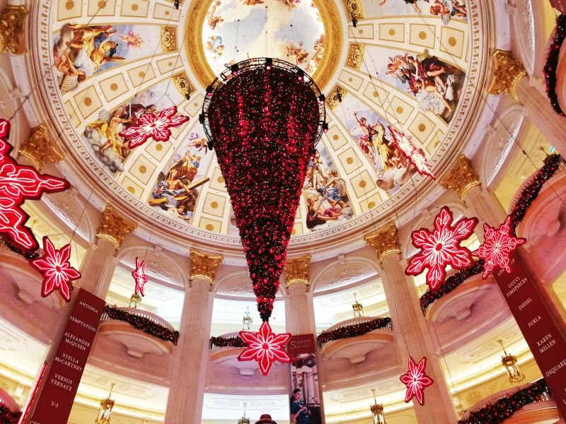 Над фонтаном свисает подвешенная «вниз головой» елка – такого новогоднего оформления я больше нигде не встречала.