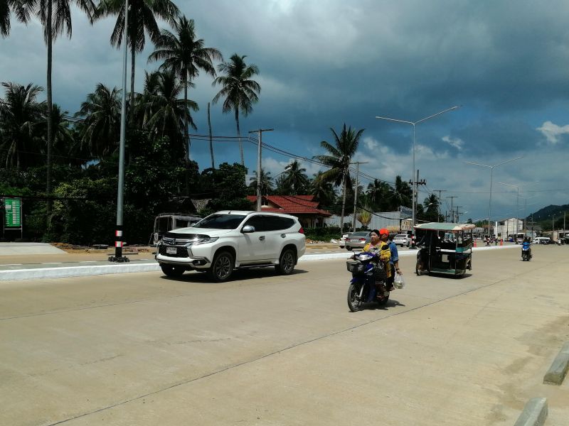 Если пройти эту зеленую зону, выходишь на дорогу, которая тянется вдоль всего побережья. В пределах пляжа дорога близко к морю не подходит, поэтому шума от транспорта нет. Хотя чтобы пройти к дороге и выйти в поселок, понадобится всего 5-10 минут. Дорога широкая, хорошая, явно рассчитана на гораздо бОльший поток туристов и транспорта – сделано с перспективой.