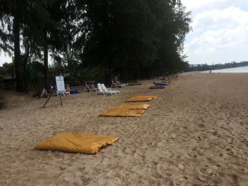 Есть лежаки, они принадлежат отелям, но за плату можно арендовать. Можно даже расположиться на таких вот мягких матах, больше я такого нигде не встречала.