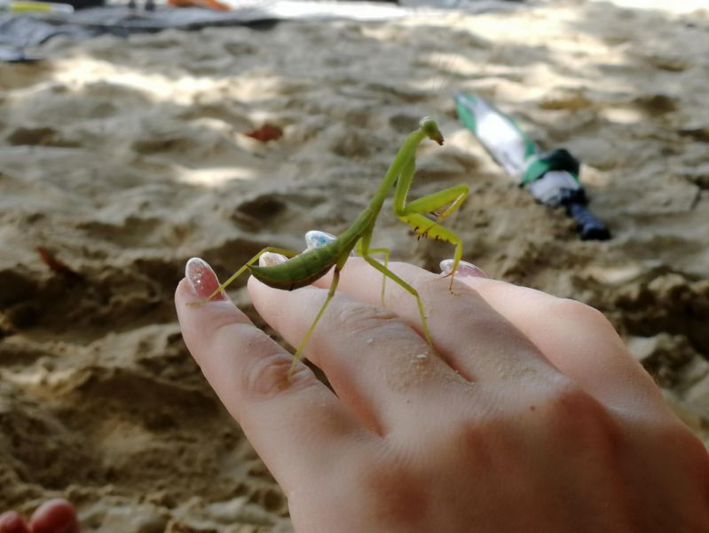 А еще мы здесь познакомились с богомолом. Спасаясь от птицы, он прискакал к людям – прямо к нам на полотенце. Он позволил себя подержать и даже станцевал нам. Богомол достаточно долго находился с нами, не делая попыток убежать – да и куда бежать, если птица постоянно находилась рядом. Потом мы его просто отнесли в кусты.