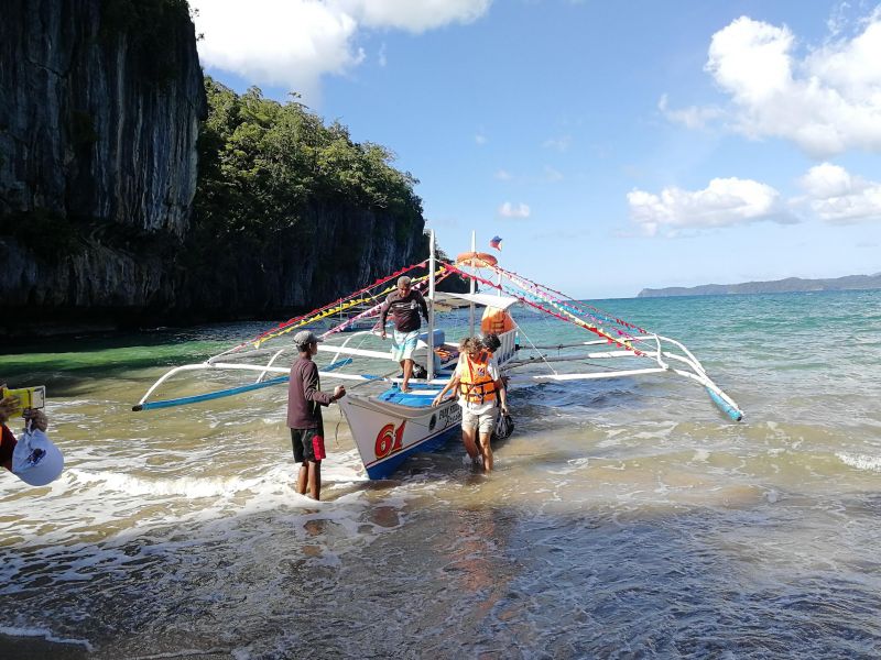 Автобус, на котором мы приехали из Пуэрто-Принцесы, останавливается недалеко от причала. Здесь проверяют наличие пермитов и формируют группы. Далее в сопровождении гида на лодке-бабочке, традиционной для Филиппин, отвозят к месту, от которого начинается собственно экскурсия.