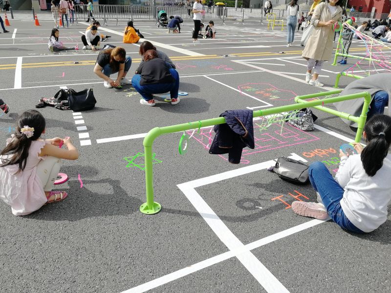 В одном месте дети и даже взрослые сидели прямо на асфальте и из цветного скотча клеили на асфальте разные картинки.