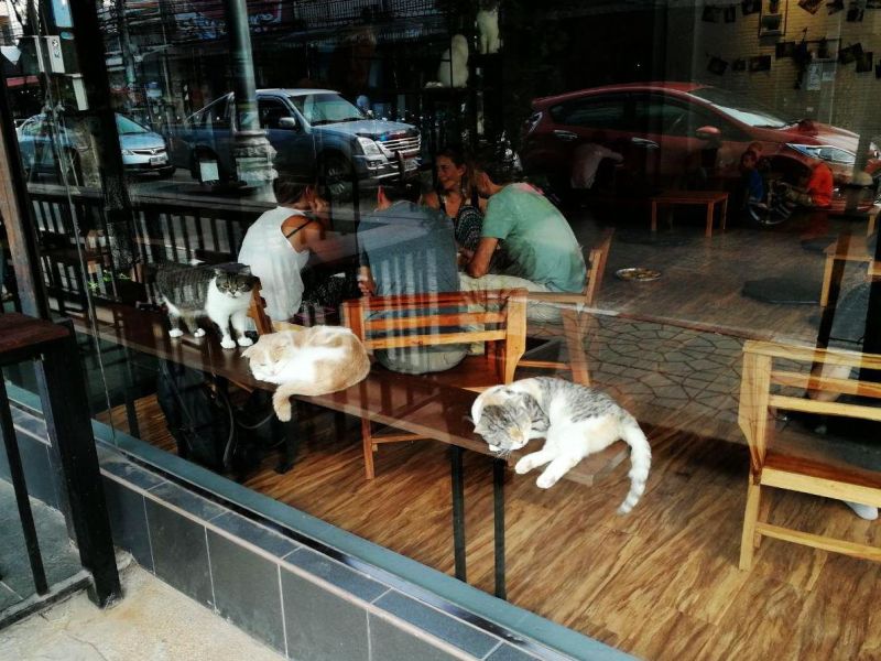 Кафе с котиками (cat cafe) - благодаря стеклянным стенам, полюбоваться на вальяжно развалившихся котеек можно прямо с улицы.
