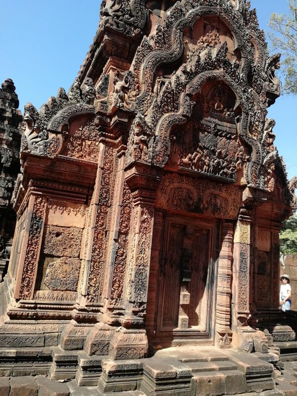 Название храма в переводе с кхмерского означает “Цитадель Женщины” или “Убежище Женщины”. И он действительно весь очень “женский” - такой изящный и изысканный. Храм весь сделан из розового песчаника, аналогичного тому, из которого сделан древний город Петра в Иордании. Поэтому Бантей-Срей называют еще “Розовым храмом”. Это единственный храм в Камбодже, сделанный полностью из песчаника розового цвета, остальные храмы Ангкора построены из серого песчаника. Говорят, что в лучах рассвета или заката храм приобретает необыкновенный цвет. Но нам это, к сожалению, увидеть не довелось.