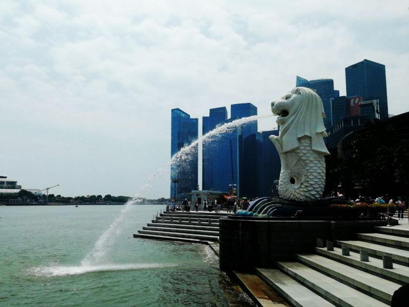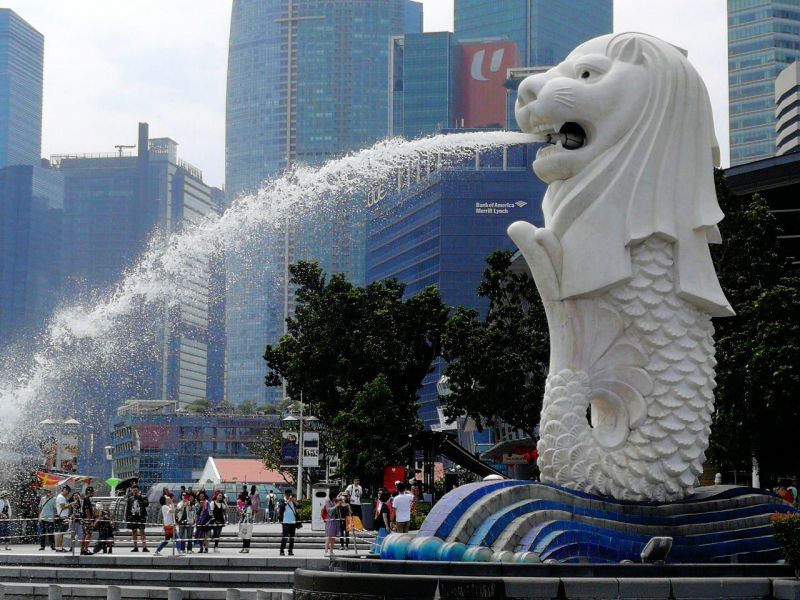 Далее по маршруту видна статуя символа Сингапура – мифического существа Мерлиона (Merlion) с хвостом рыбы и головой льва. Пройти к нему можно по небольшому мосту.