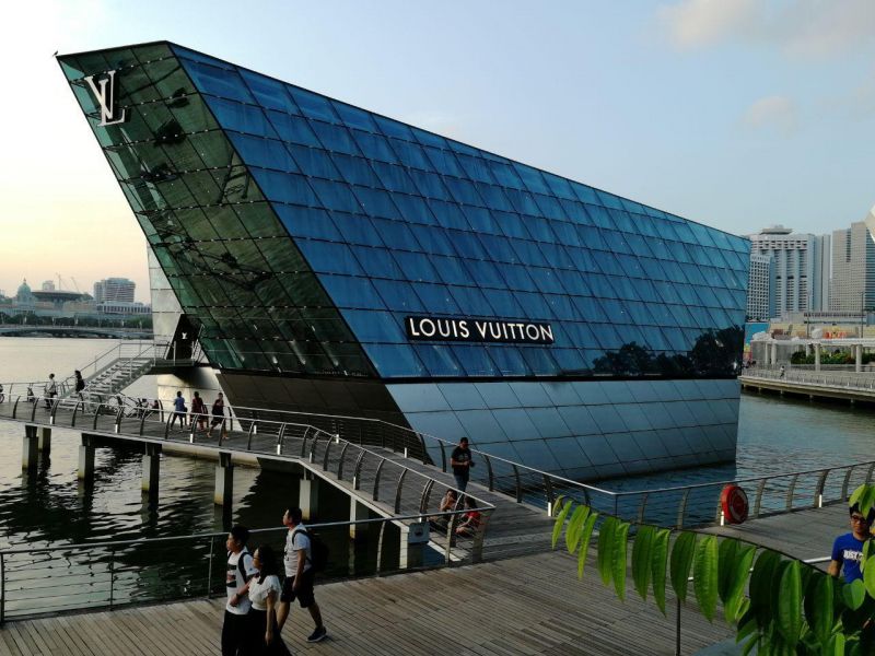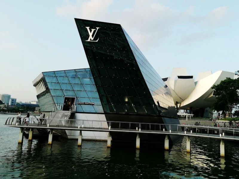 Магазин брэндовых сумок Луи Витон представляет собой бутик-остров. Дом Louis Vuitton разместил свой магазин прямо в заливе. Здание, похожее на кристалл, выступает из воды и поражает своим оригинальным дизайном. Пройти в магазин можно по мостику.