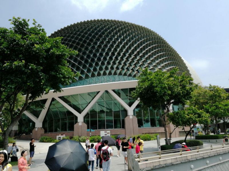 Первым объектом, который я увидела, подходя к заливу, и который меня просто сразил, был театр Эспланада (The Esplande). Это театрально-выставочный комплекс, выполненный в стиле модерн. Причем, еще какой модерн! Театр спроектирован в виде двух половинок дуриана – того самого фрукта, который получил известность благодаря своему необычному и очень неприятному запаху. Форма фрукта также необычна. Он похож на большую колючую шишку.