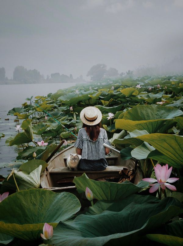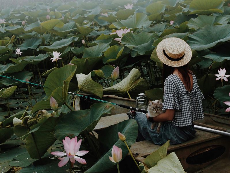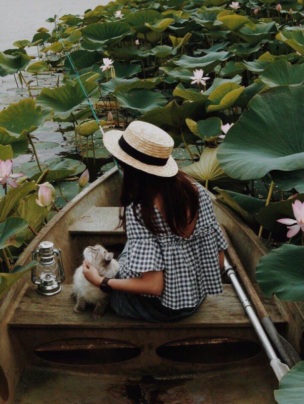 Мы пробирались через заросли на двух лодках. Одна была моторная, и к ней мы привязали мою, где я сидела с котом и командовала каким бортом ее развернуть , чтобы в кадр попал красивый вид. Когда место было выбрано, я прыгала с лодки на лодку, выстраивала композицию и свет, параллельно обучая маму. Затем садилась на место, после щелчка прыгала в другую лодку посмотреть, получился ли кадр. Вот итог. Это было крайне сложно и даже опасно. Стебли лотоса то и дело наматывались на винт мотора лодки, что отбуксировала меня в заросли, мотор булькал и кашлял.