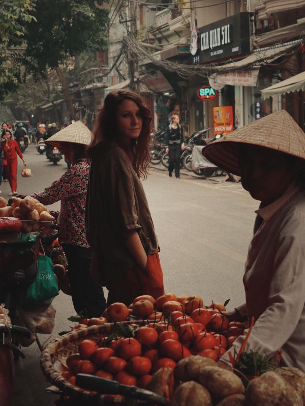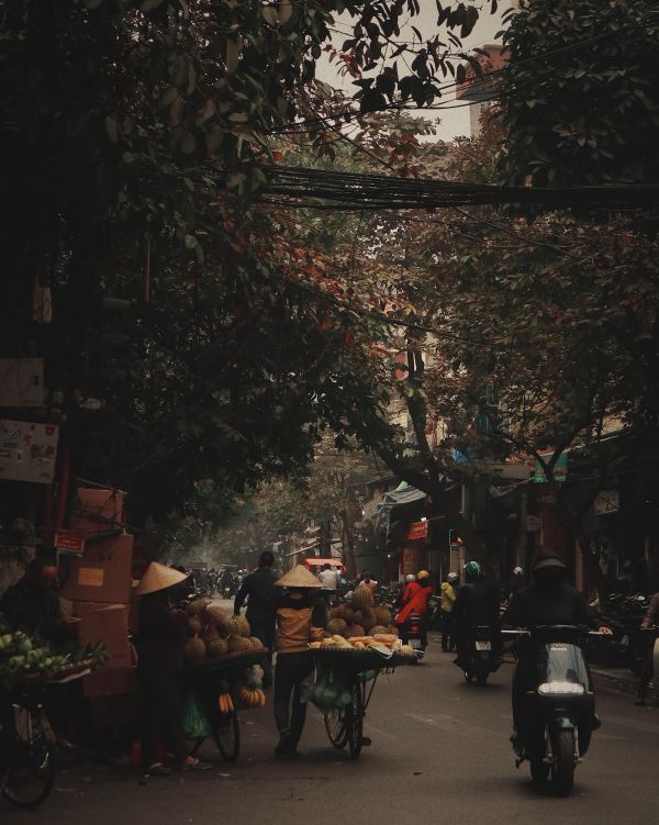 Женщины в конусообразных шляпах предлагают попробовать экзотические фрукты, если ты турист(а тебя сразу видно и ты не притворишься вьетнамцем), то на каждом шагу тебе будет предложено купить фруктов, вьетнамскую сумку или шлёпанцы, взять мото-такси или лапшу с куриными лапами(не мясными ножками, а именно лапами с когтями).