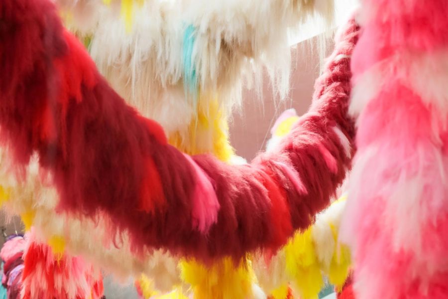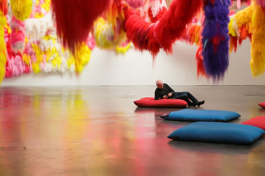 Но на мой взгляд тут не надо пытаться понимать, а надо просто стоять и воспринимать то, что видишь. Эта огромная инсталляция из ниток китайского (вроде) автора, великолепна. Она не понятна, но под ней лежать пуфы, если лечь на которые можно просто созерцать и медитировать на эти линии и цвета.