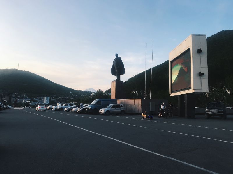 Площадь Озерновской косы — связующее звено между озером и бухтой. Здесь играют песни из советских фильмов, дети катаются на велосипедах, а взрослые качаются на городских качелях (вроде тех, что стоят в Москве на Маяковской). В теплое время года все это напоминает Геленджик или любой другой город-курорт юга России.Через дорогу расположилась площадь Ленина, она же автомобильная парковка. Среди машин и рекламных вывесок стоит воинствующий Ленин — его плащ развивается как у супергероя, поэтому горожане зовут его Бэтмен.