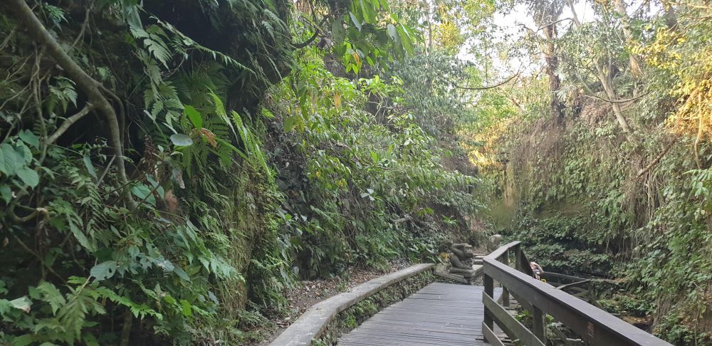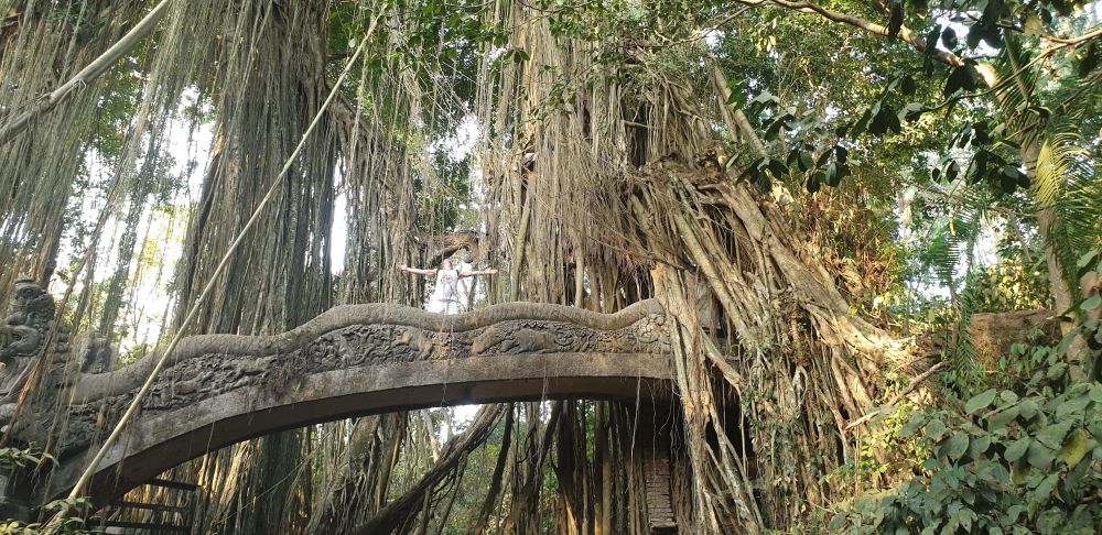 Различные статуи демонов и богов, барельефы, каменистые заборчики, запутанные дорожки, мостик над пропастью, речка - все очень атмосферно и эпично.Повсюду каменные макаки, поросшие мхом, придают загадочности в атмосферу места. Чувствуется, что им и лесу больше сотен лет. Не хотелось бы думать, что в этом лесу в далёком прошлом ели людей. Да в основном этим славился Калимантан в Индонезии, но кто же может знать всю правду.