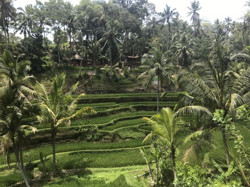 Вся плодородная земля на Бали приспособлена под рис. Вдоль дорог, на холмах, даже прямо у кафе – везде растёт рис. На склонах холмов формируют ступени, чтобы увеличить площадь посева, на которых и возделывают рис. Такие поля и называют – террасы.