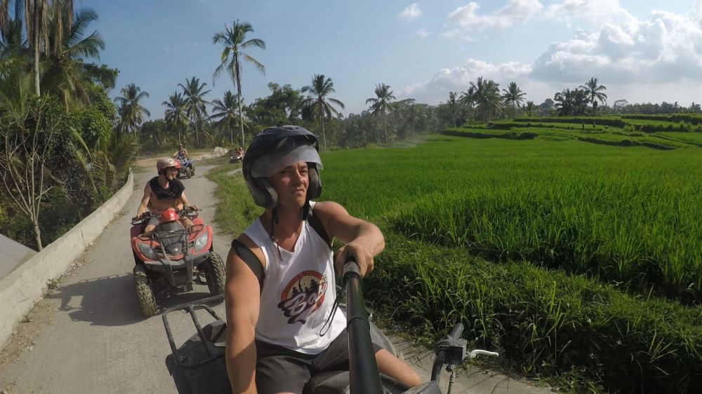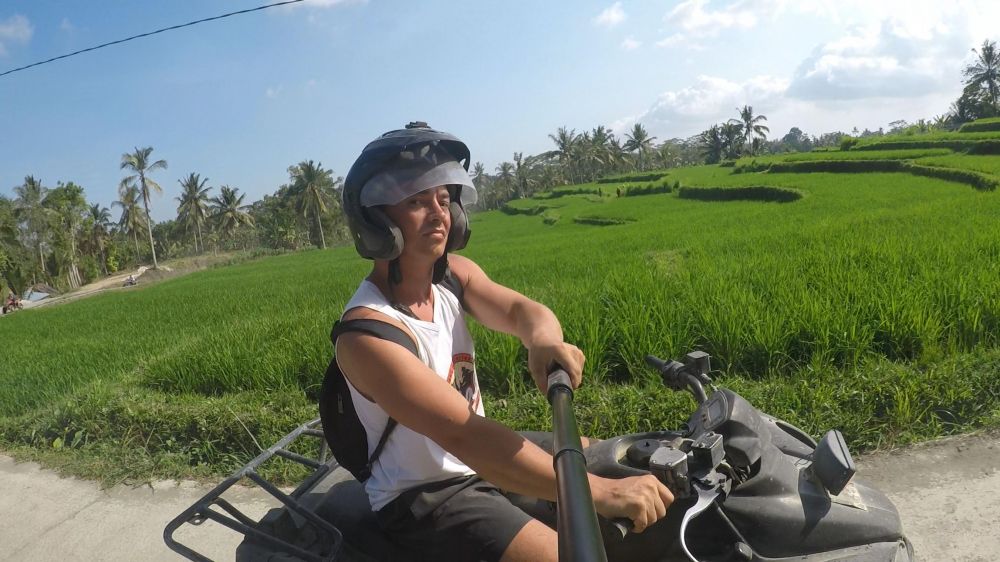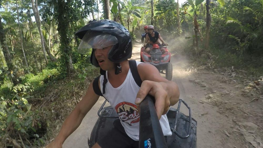 - Если берёте с собой камеру, то стоит учесть, что во время управления квадроцикла руки заняты рулём. Рулить одной рукой без опыта тяжело, т.к. держать ровно газ и руль при этом пересекая препятствия получится не сразу и далеко не у всех. Поэтому к камере лучше иметь крепления на тело. Если такой камеры нет - ничего страшного. На всей протяженности пути Вас будут фотографировать и в конце тура предложат фото по весьма не демократичной цене. Здесь торговаться можно, но сложно, т.к. товар уникальный и для вас очень интересный, а они это прекрасно понимают. Подробнее о деньгах на Бали читайте в моём посте "Деньги и связь"