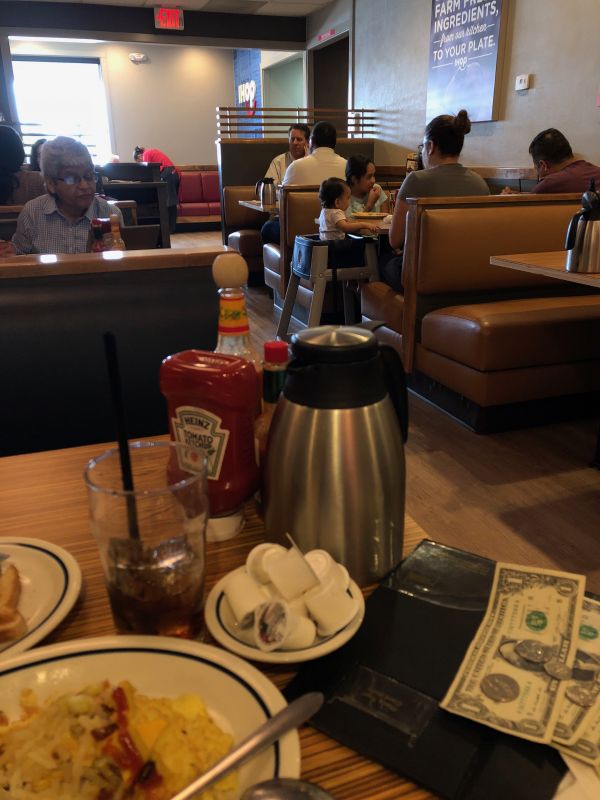 После общения с неживыми, мне захотелось поесть и увидеть уже живых людей. Я набрел на типичную придорожную кафешку и отобедал типичным американским блюдом. Омлет, картошка жареный лук и напиток. И конечно кофе, который мне подливала официантка, каждый раз, когда проходила мимо. Все это обошлось 15$. Нельзя не упомянуть кетчуп Heinz, который стоял на столах во всех придорожных кафе Америки, которые я посетил.