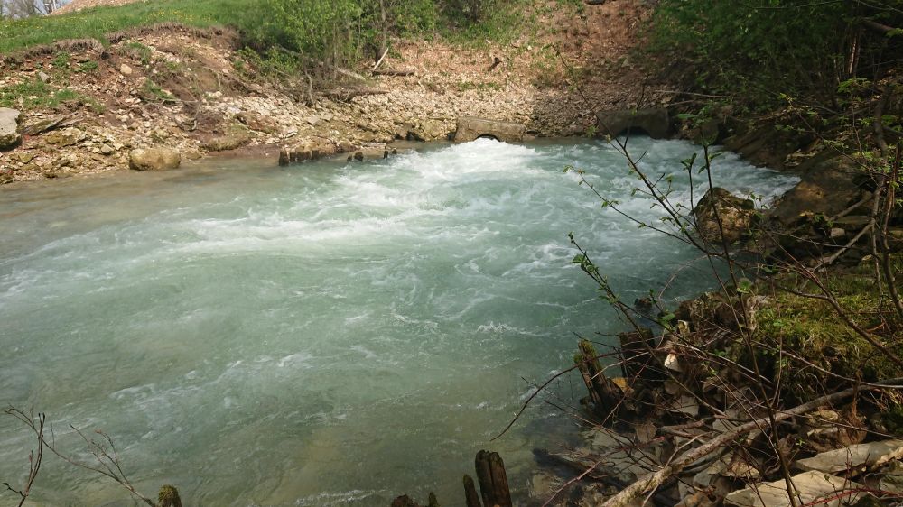 Мощные потоки воды выходят со дна двух огромных соединившихся карстовых воронок. Глубина меньшей воронки — 20 м, глубина действующей воронки — 38 метров.