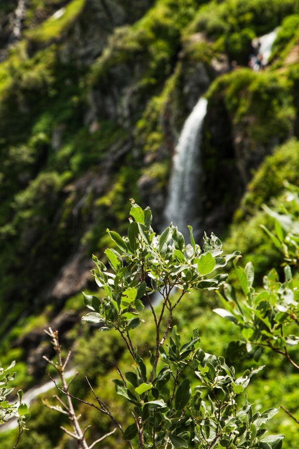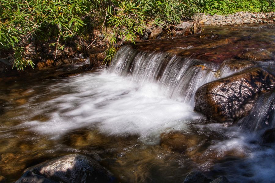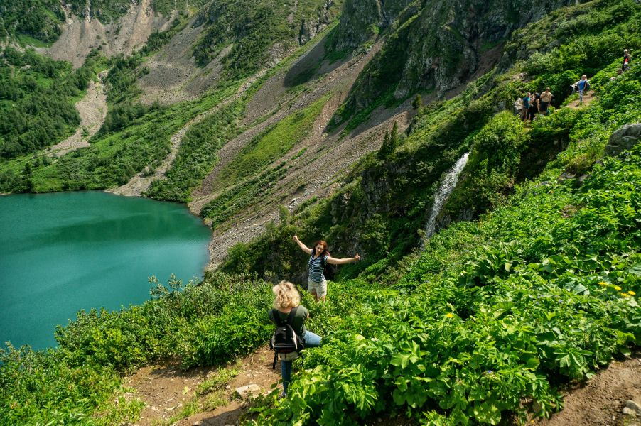 Из второго озера вытекает мощный ручей, образуя на крутом склоне живописный бурный водопад.
