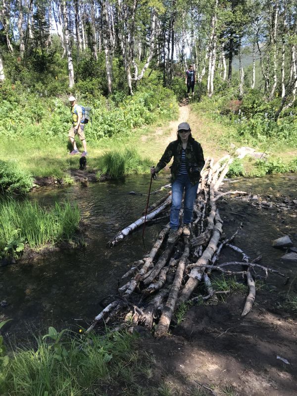Во второй раз переходить ручей пришлось самостоятельно, по переброшенным через него деревьям.