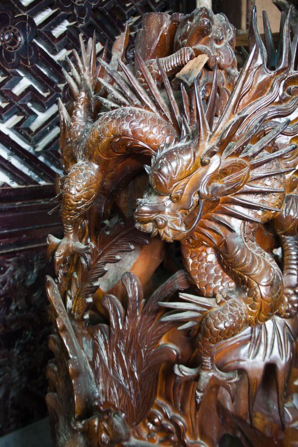 Слева от пагоды – храм из трех башен, тоже с драконами (куда же без них), а в центре зала установлена статуя Будды.