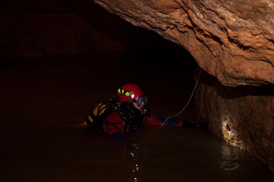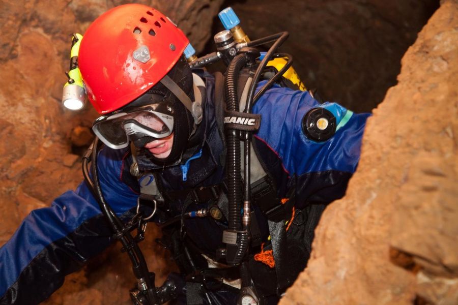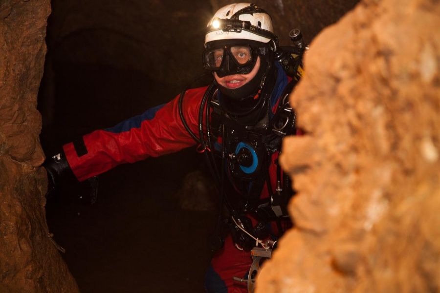 Вообще, это было мое первое купание в пещере. Назвать погружением причудливый танец, напоминающий одиночное синхронное плавание с заныриванием и выписыванием кренделей под водой кверху ластами, язык не повернется. А все потому, что у меня никак не получалось сдуть воздух из сухого гидрокостюма, который был мне малость не по размеру. Кнопка поддува съехала почти под мышку, нащупать ее под водой и нажать в толстых неопреновых перчатках было проблематично. А воздух от моих телодвижений плавно перетек в район ступней, разместился там, и меня перевернуло, как поплавок.