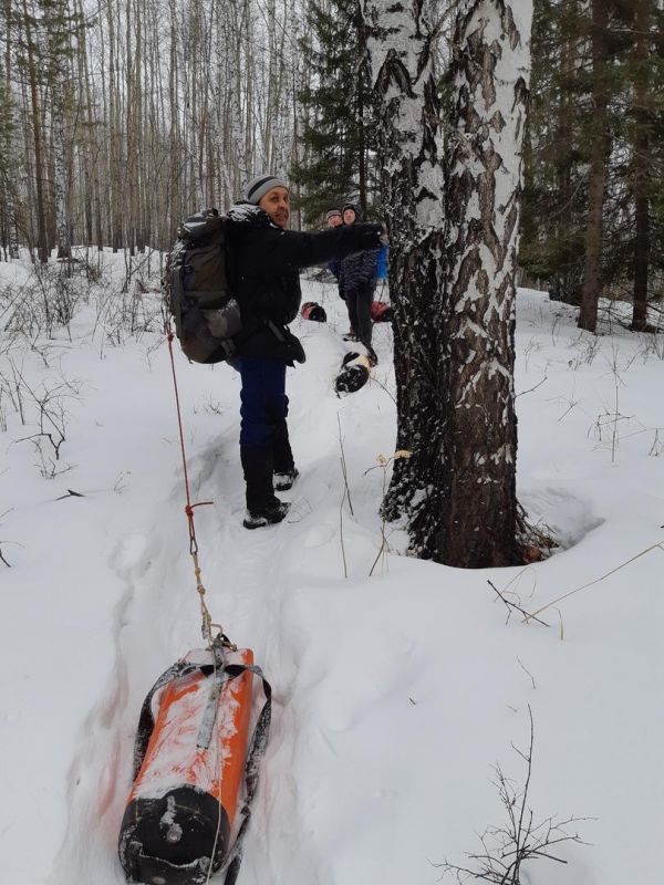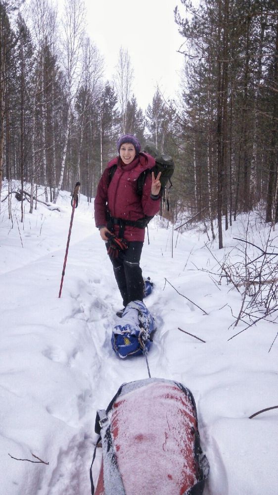 Все водолазное оборудование тащили сами, волоком по снегу, в трансах, привязанных к рюкзакам. Со стороны казалось забавным, такой паровозик получился. Но в горку тяжеловато, особенно если учесть, что я еще тащила в рюкзаке все свое фотооборудование.