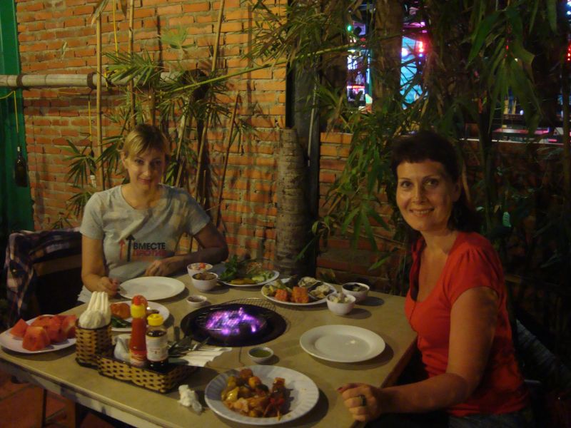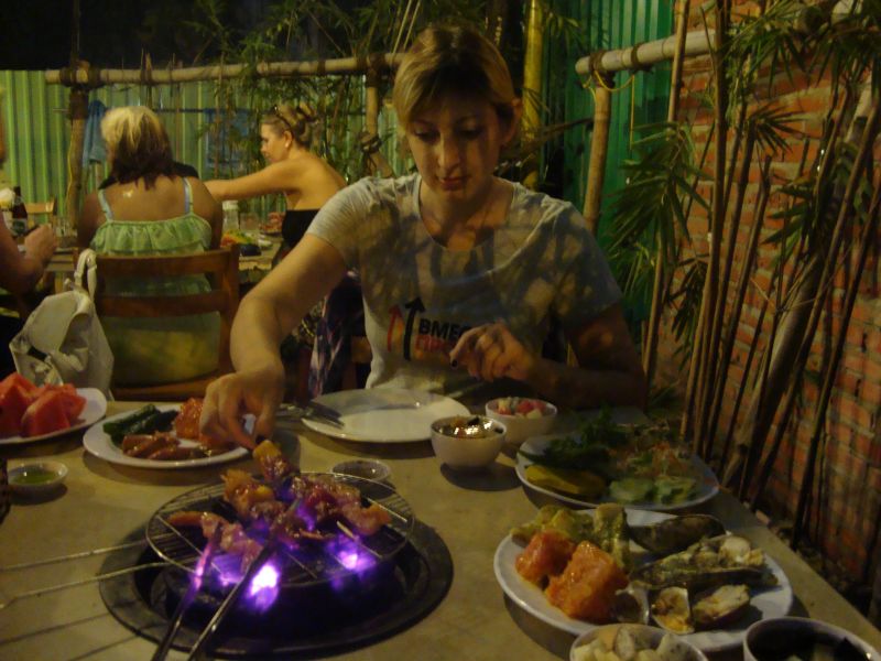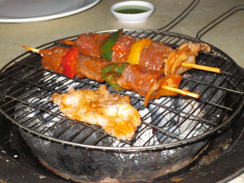 Официант неплохо говорил по-русски. Он показал нам, как пользоваться жаровней, сказал, что будет неподалеку, и его можно позвать в случае чего, но в течение вечера мы видели его только 2 раза, когда он подходил поменять догорающие угли.