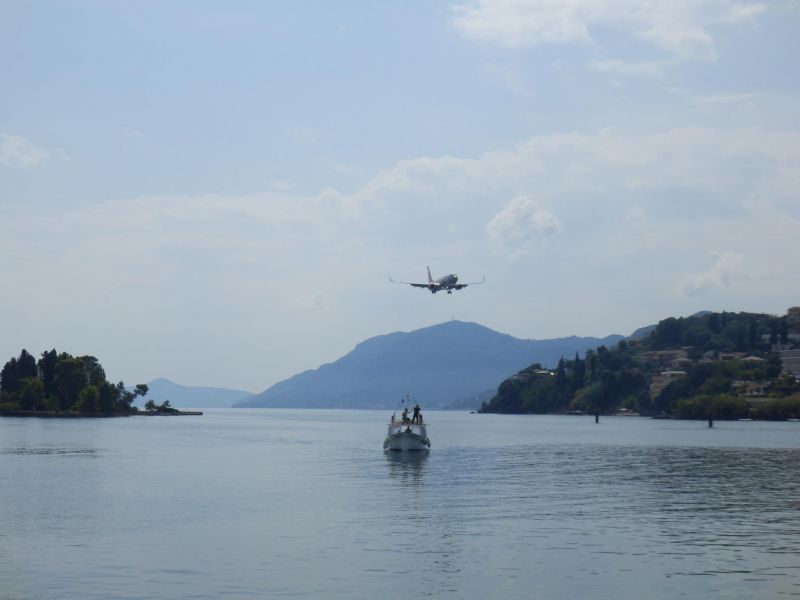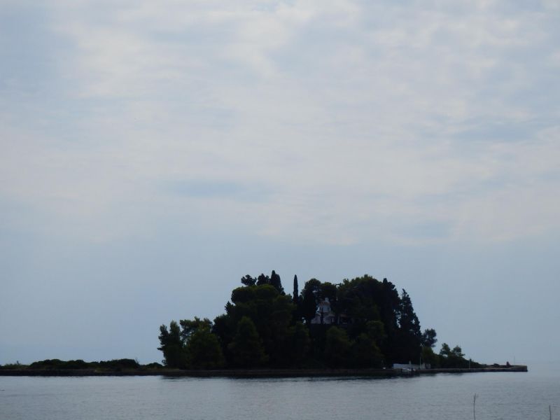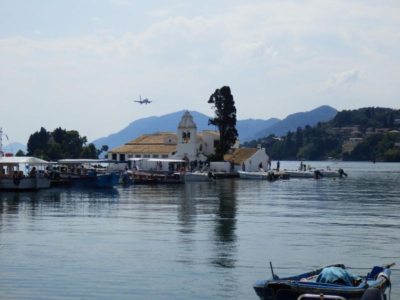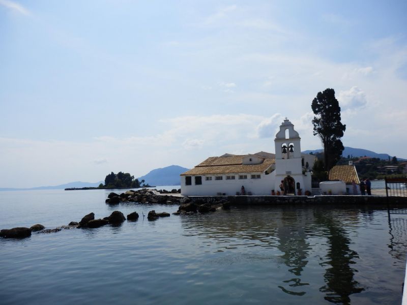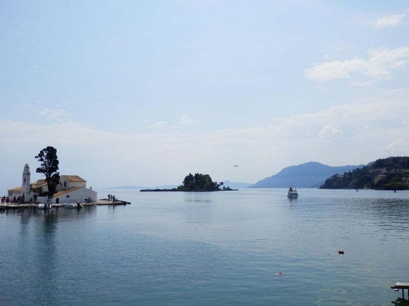 Буквально в нескольких сотен метрах от полосы находятся два очаровательных небольших острова, один c белоснежным монастырем Влахерна и часовней Девы Марии, и второй - крошечный Понтикониси (с греческого он и переводится как «мышиный остров») на нём расположен монастырь Пантократор, построенный в XII-XIII вв., но, к сожалению на втором не побывала, только любовалась с берега.