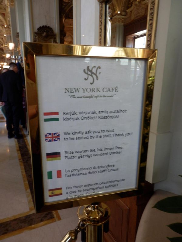 В Будапеште на улице Erzsebet Korut 9-11 находится отель New York Palace на первом этаже которого расположены одноименное кафе и небольшой ресторан. Вход в кафе с улицы с торца здания, слева от главного входа в отель.