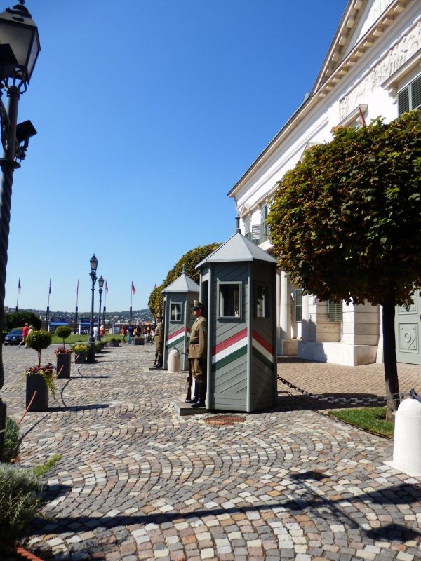 По прибытию и на выходе из оборудованного павильона сразу окажетесь на площади Святого Георгия, фактически являющейся и смотровой площадкой рядом с Президентским дворцом Шандор (Sandor Palace, Budapest, Hungary). Каждый час около него совершается смена почетного караула.