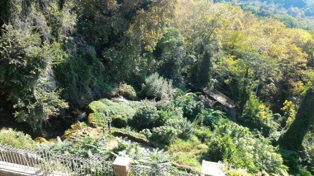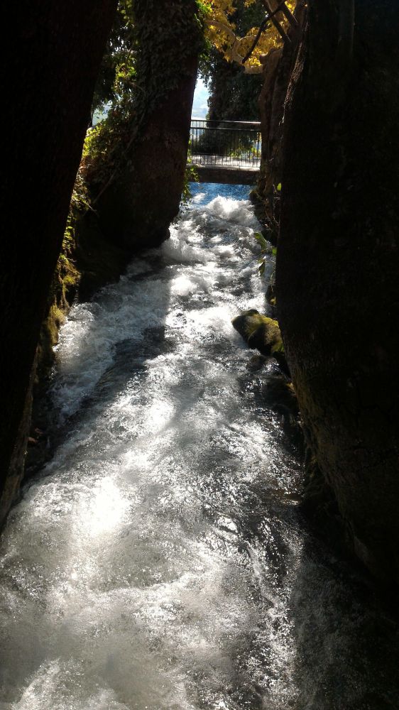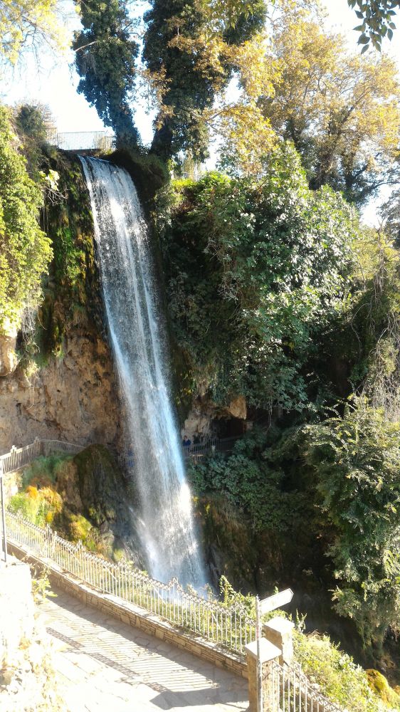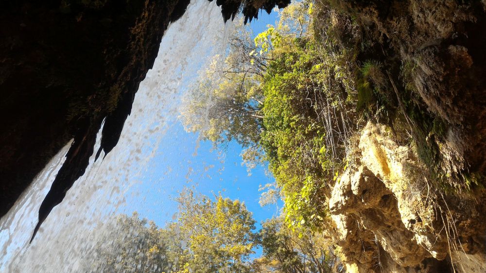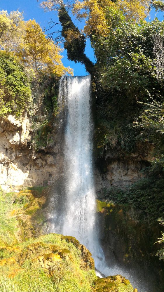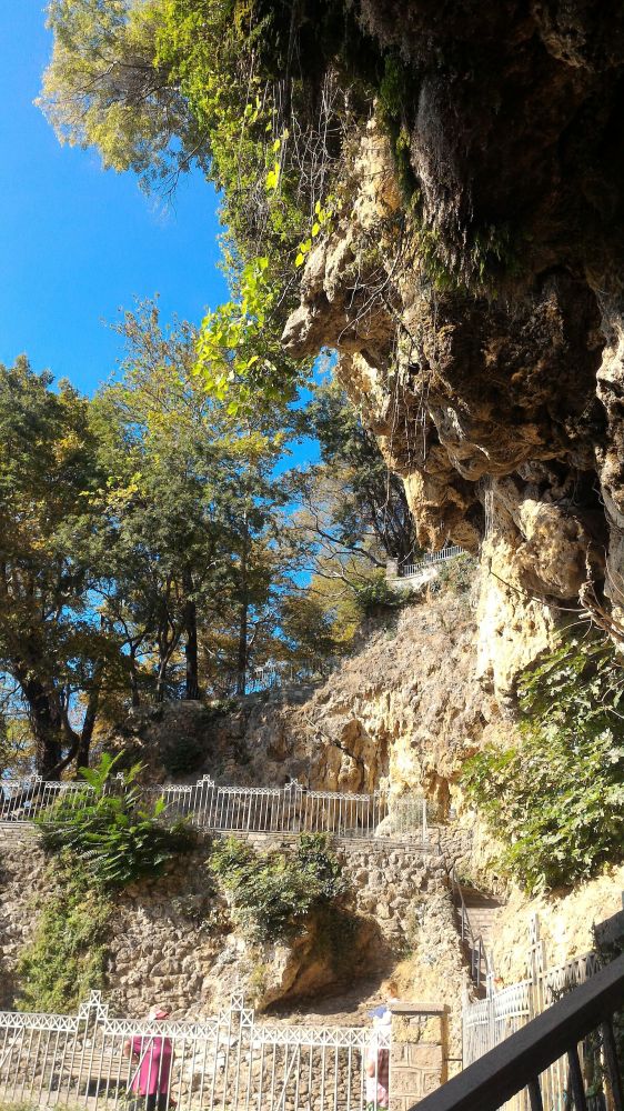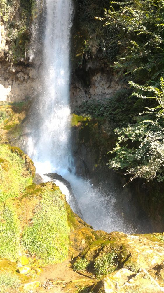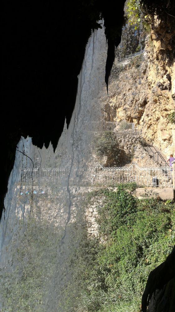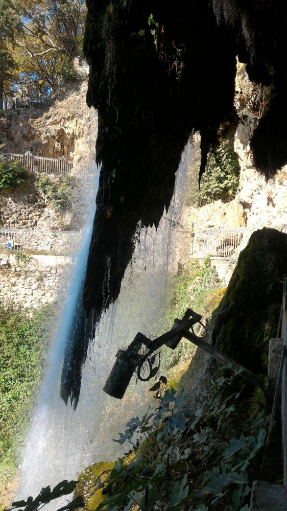 Доступ к водопаду облагорожен. Наверху расположена большая смотровая площадка, есть скамейки, небольшой пещерный грот, от начала водопада также можно спуститься вниз по каменным узким ступеням, но они в отдельных местах достаточно скользкие от попадаемых брызг воды, конечно в воде и каплях воды все вокруг, поэтому до самой конечной точки не добралась. Но, и осуществленного спуска-подъема для впечатлений было предостаточно от такой невероятной красоты. Что смогла увидеть с промежуточной (средней площадки) – с высоты вода спадает дальше в виде красивейшего каскада, растекаясь в ширину. На верхней площадке от начала водопада под отвесной скалой есть небольшой проход, вот где восторг! Ты можешь увидеть изнутри поток стремящейся вниз воды.