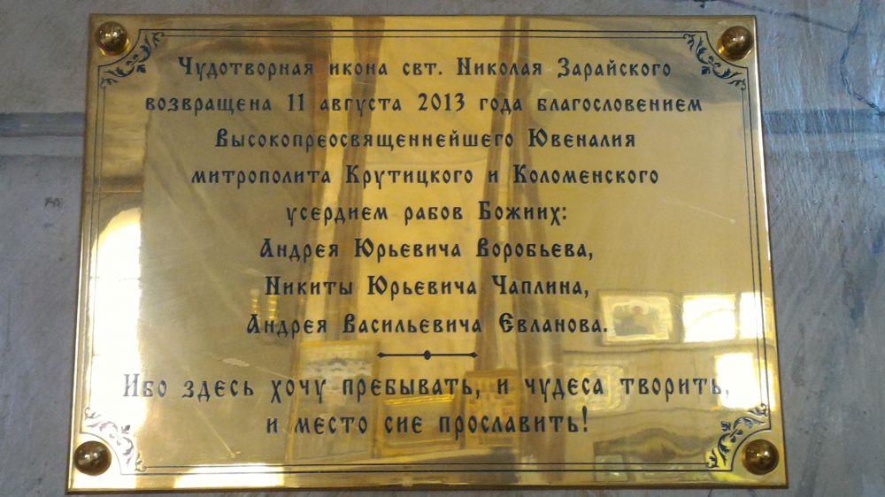 И только в 2013 году, спустя почти полвека Чудотворная икона Николы Зарайского вернулась на свое историческое место в отреставрированный Иоанно-Предтеченский собор Зарайского кремля.