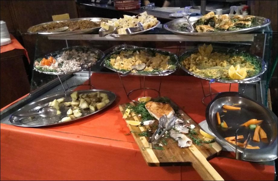 Берите тарелочку, накладывайте и садитесь за свободное место. Когда подойдёт официант – говорите ему – «Aperitivo». Мы в январе 2020 наелись от души, заплатив за аперитив всего 9,5 евро.