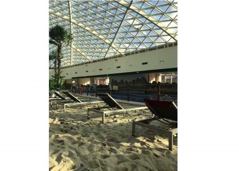 Сам аквапарк довольно средний, горы из под купола видно, но только под некоторыми углами. Порадовал песок, и температура: 34 градуса воздух, 32 градуса вода.