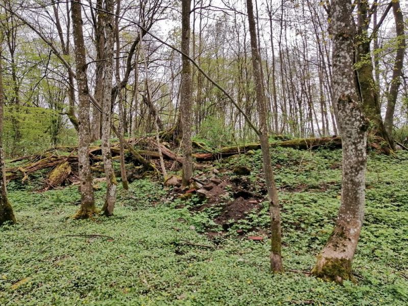 Набрели на остатки старой немецкой усадьбы. От нее остался лишь холмик , да разрытые кладоискателями ямы.