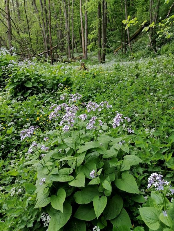 Так выглядит отдельный куст лунарии на фоне зелени леса и белого ковра цветущей черемши