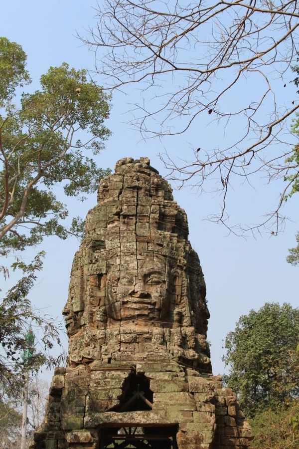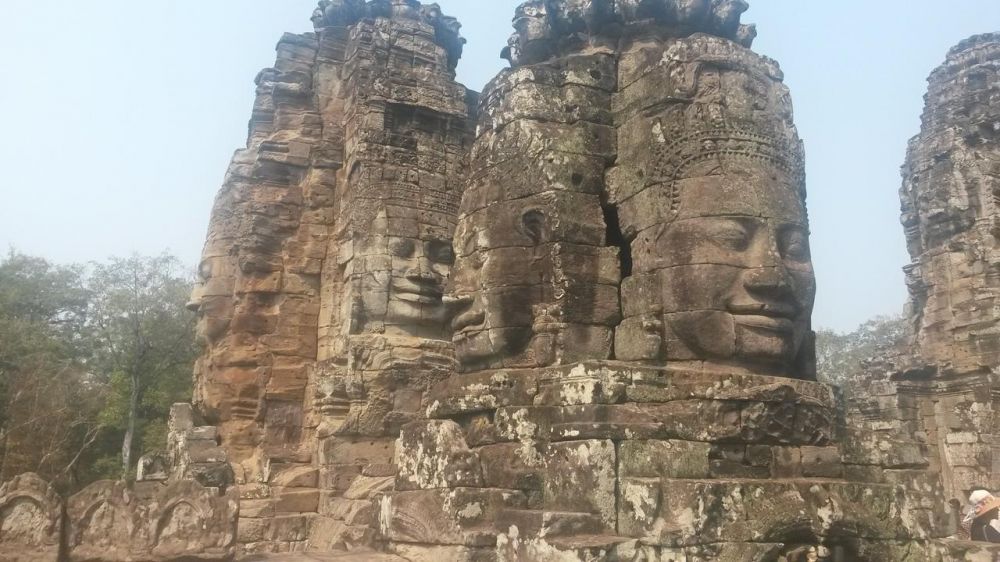 Ещё один интересный индуистский храм - Байон. Он возводился в середине XII века в эпоху правления короля Джаявармана VII и посвящен прославлению Будды. Перед туристами предстает монументальный храм-гора будто созданный самой природой. То тут, то там возникают фантастические глыбы, похожие на каменные головы. Байон считают каменным чудом, поразительным видением для человеческого глаза. Но самое главное в этом храме – его центральная башня, символизирующая центр мироздания или мировую гору. Изначально в центре башни располагалась фигура Будды, высота которой достигала 4, 75 метров. К сожалению, до наших дней дошли только её фрагменты. Вокруг башни находятся ещё 53 башни меньшего размера, каждая из которых увенчана четырьмя человеческими ликами, обращенные на четыре стороны света. Всего таких ликов – 208. Храм Байон в Камбодже имеет 54 башни, и не случайно – каждая из них являлась символом провинции, находившейся под властью правителя. На каждой башне высечено 4 лика – по одному с каждой стороны света. Древним строителям удалось сделать невозможное – выражения всех этих лиц меняются в зависимости от освещения и времени суток.