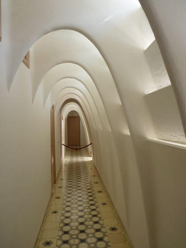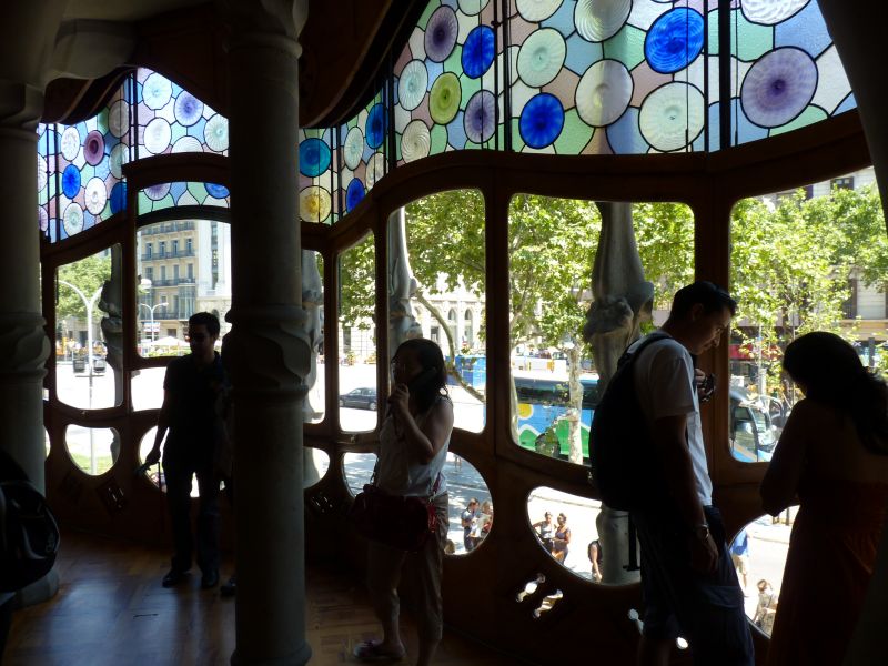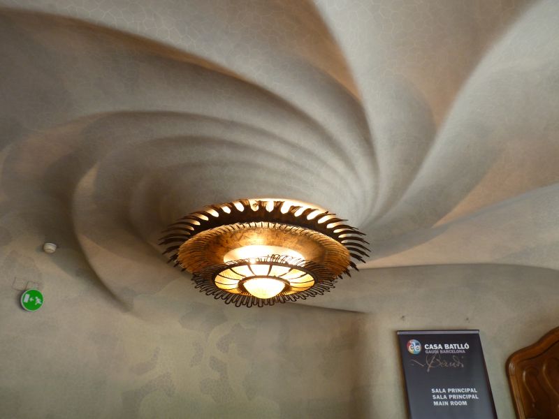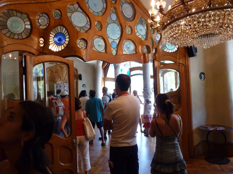 Бельэтаж – потрясающий зал с камином в виде гриба, с волнистым, плывущим потолком и дубовые двери, в которые вставлены разноцветные витражные стёкла. Громадные, во всю стены, окна выходят на Пасео-де-Грасия.