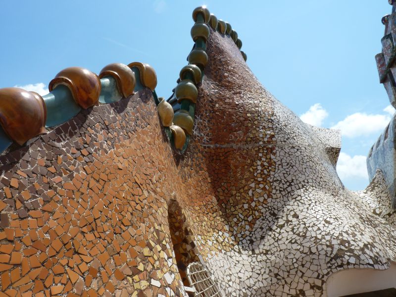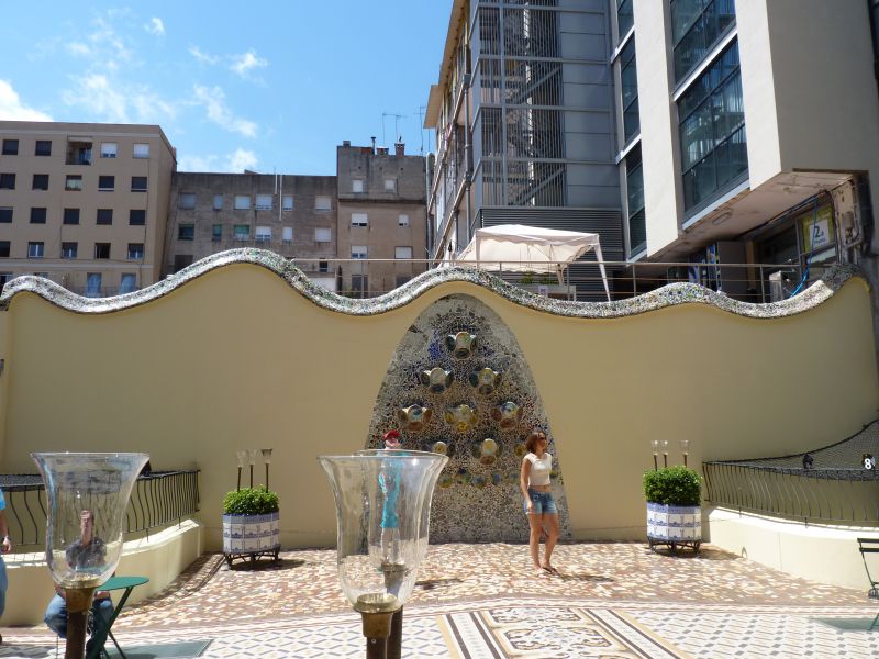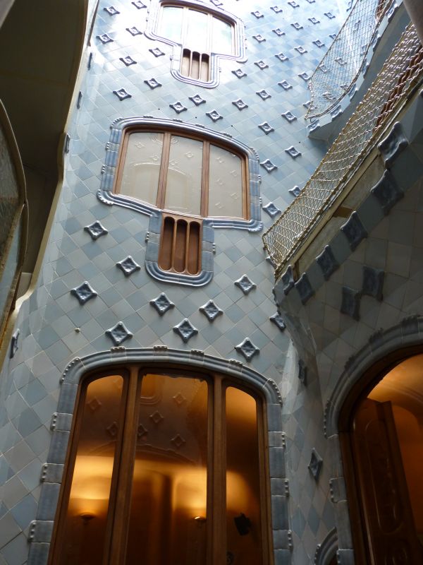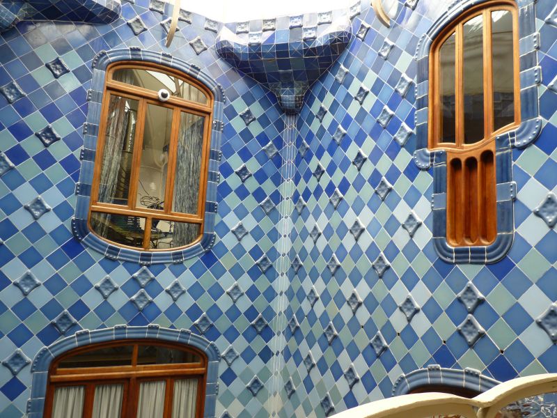 Интересно использование керамической плитки во внутреннем дворике. Нам рассказали, что Гауди подбирал и располагал плитки разного оттенка так, чтобы при взгляде на весь фасад он казался исключительно однотонным. Сверху тона более насыщенные, внизу более светлые. В то время как если бы его покрыть одинаковой плиткой, то при взгляде снизу вверх или сверху вниз оптически бы казалось, что фасад светлеет или темнеет. Также для оптического эффекта верхние окна меньше. Если смотреть сверху, то все окна кажутся одинакового размера. Кроме того внизу окна большего размера пропускают больше света. По замыслу Гауди это должно было обеспечить равномерное освещение на всех этажах.