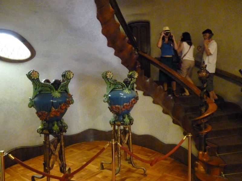 Внутри надо медленно ходить и пристально разглядывать дом. Здесь всё зыбко, всё плывёт. Но, мы уже привыкли, что таков Гауди. Волнисты ручки дверей, Стёкла лестничных площадок искажают отражение керамической плитки внутреннего дворика, заставляя его плыть.