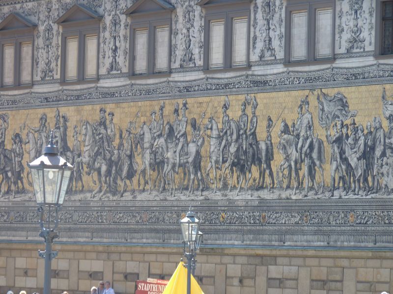 Панорама Шествие князей сделана из фарфоровой плитки, мейсенской плитки. Одна плиточка имеет размер 20,5см*20,5см. Всего таких плиток 23000! Почти 102 метра в длину и десять с половиной метров в высоту. На данной картине едут 35 маркграфов, герцогов, курфюрстов и королей саксонских.